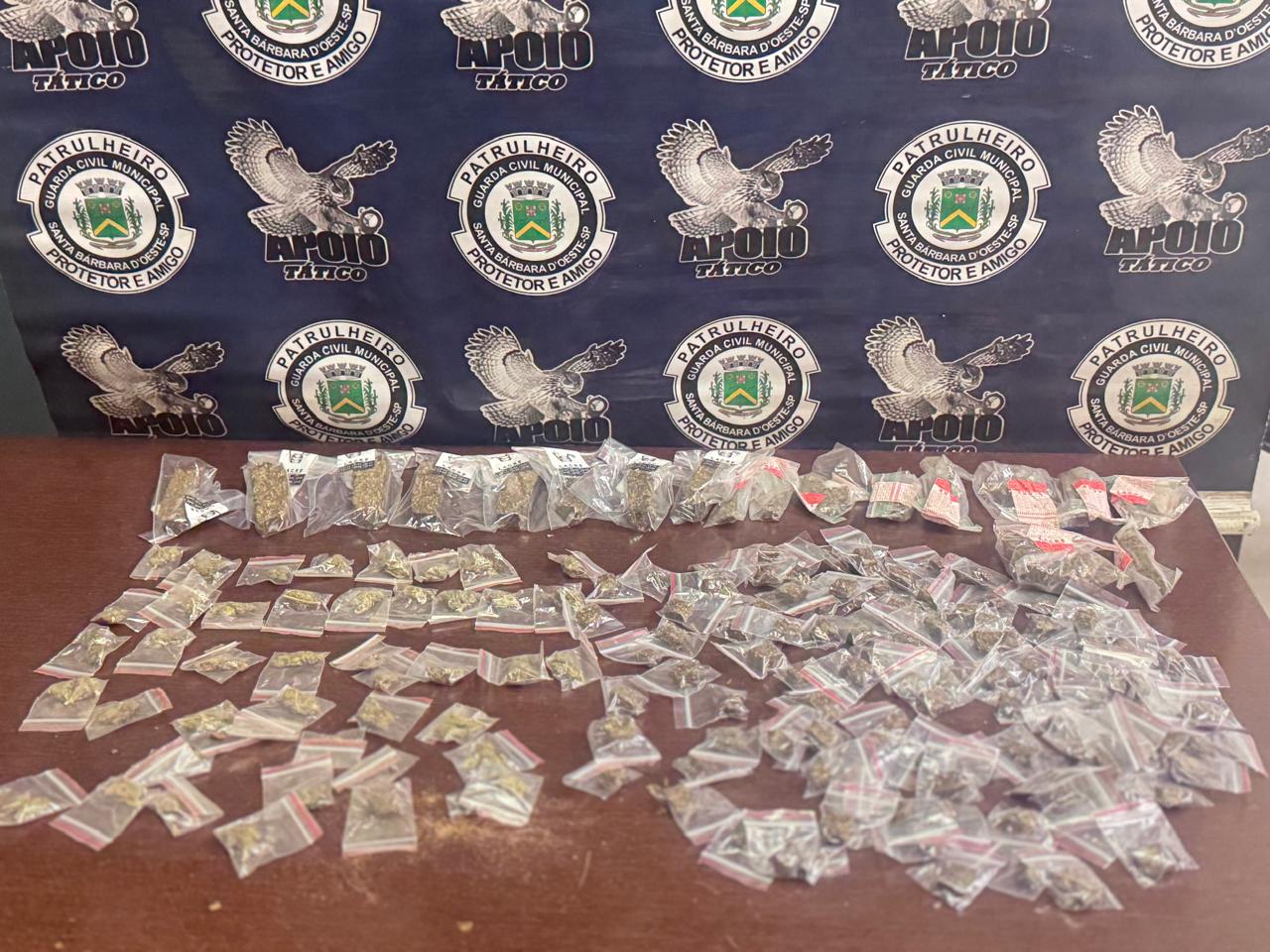 A Guarda Civil Municipal (GCM) apreendeu na tarde desta sexta-feira (26) 880 porções de drogas, no Jardim dos Lírios, em Americana. Um homem de 30 anos, foi preso. Equipes da GCM com o auxílio do cão Draco, localizaram em um imóvel na Rua Jaçanã, 741 porções de maconha, 82 pedras de crack, 57 unidades de cocaína e R$66. O homem foi encaminhado para a Polícia Civil de Americana (PCA) e autuado em flagrante por tráfico de entorpecentes. Imagem: GCM