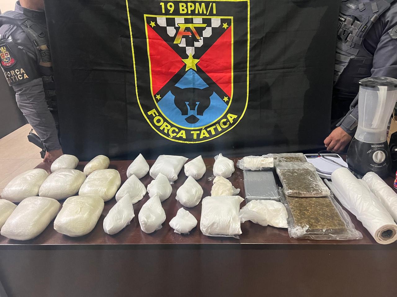 Na sequência, os policiais seguiram para o apartamento do abordado no Condomínio Amarilis, no Jardim das Laranjeiras, em Santa Bárbara d’Oeste, e nada de ilícito foi localizado, porém, a equipe da FT, sargento Simões, cabo Gustavo e soldado Vasconcelos, recebeu uma informação e, durante averiguação em outro imóvel no mesmo condomínio, foram encontrados 14,5 quilos de cocaína e 1,5 quilo de maconha, além de outros objetos.