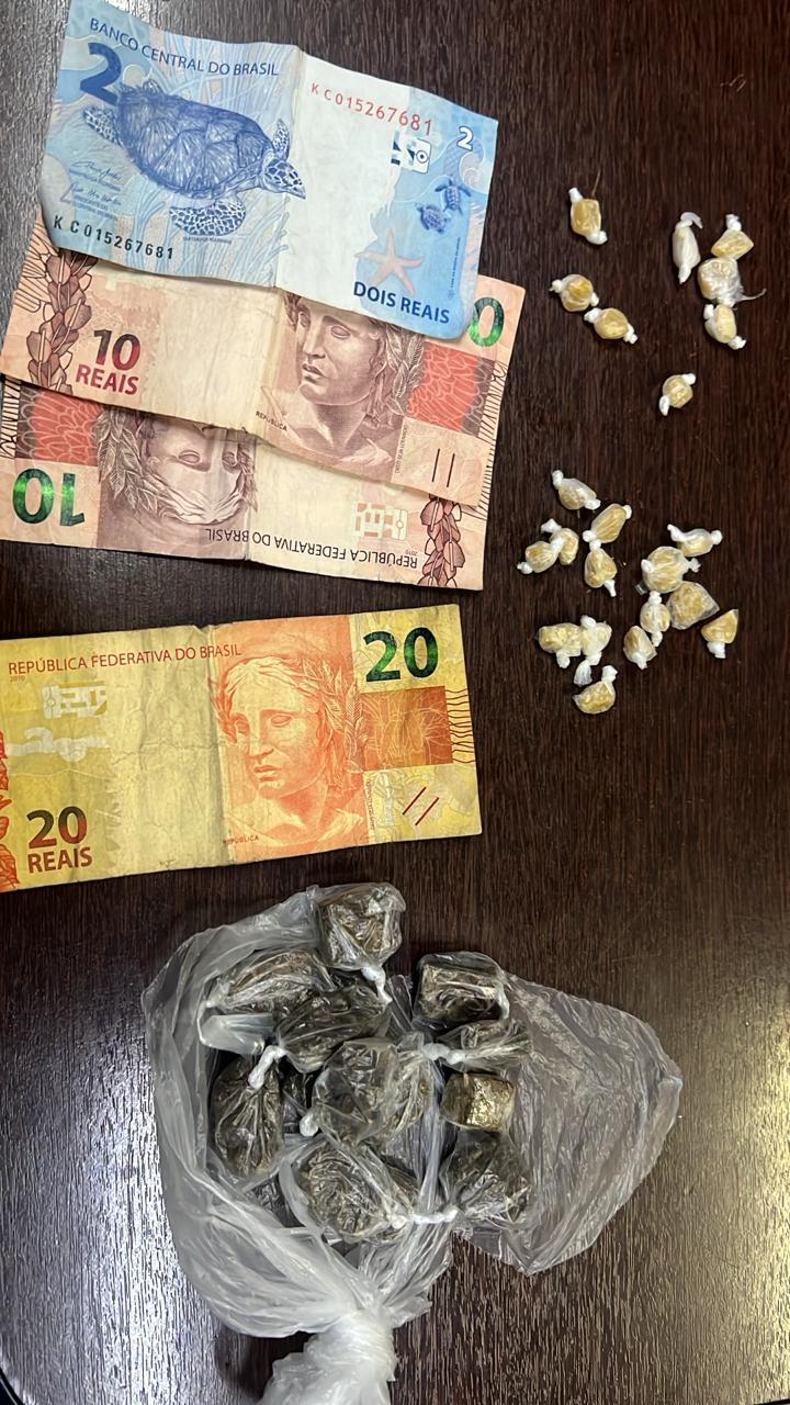 No barraco foram apreendidas: 16 porções de maconha e 14 cocaína, 14 pedras de crack e quase R$ 4.000,00, divididos em cédulas e moedas.