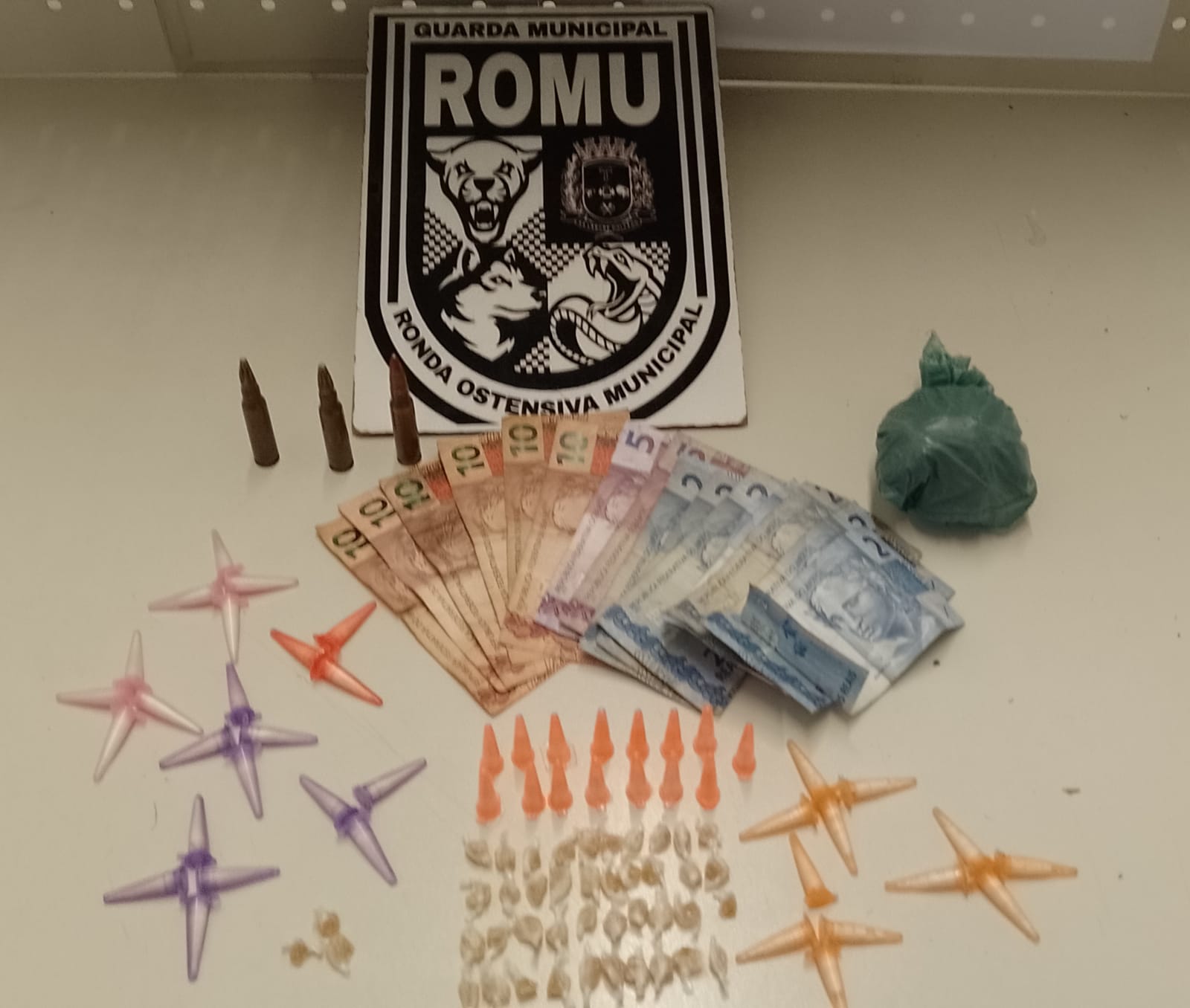 Por volta das 17h na Rua Antonio Fugolin, a equipe da Romu, subinspetor Siderlei, Montalvão, Alexandre e Aguilera, realizava patrulhamento e na tentativa de abordagem a dois suspeitos, um deles correu e não foi encontrado. Já um jovem de 22 anos, foi detido. Na sequência, com o auxílio do cão Draco e de outras equipes da GCM, foram encontrados 49 pinos com cocaína, 43 pedras de crack, 1 porção de maconha, 3 munições calibre 7,62 e R$ 90.